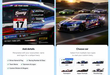 Design professional racing liveries instantly — no Photoshop, no experience needed.